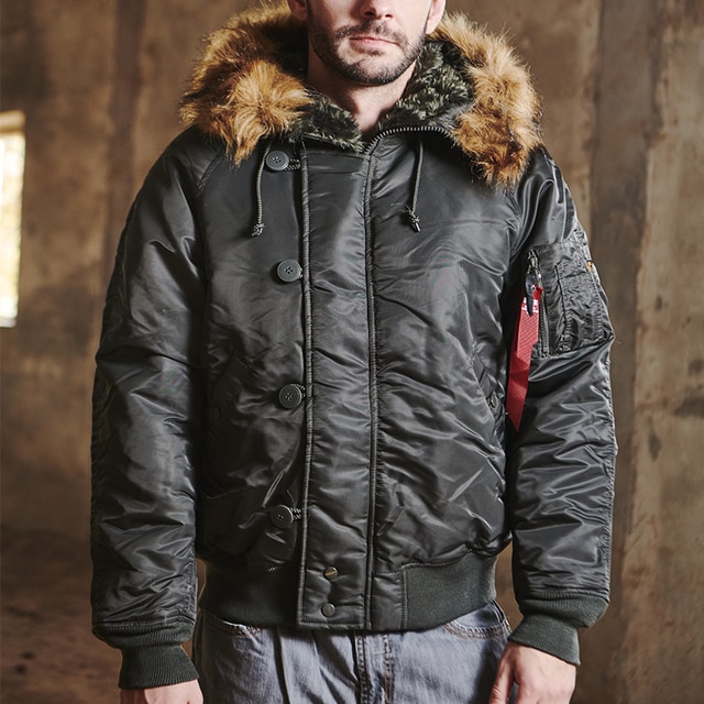 The N-2B short waist parka is meant to withstand freezing temperatures, with its 100% water repellent nylon shell and polyester interlining. Unique ‘pass through’ front pocket was created for pilots to have the ability to reach into their pants pockets without subjecting their hands to cold temps. For extra protection, the hood is lined and trimmed with synthetic mouton fur. This dry clean only N-2B parka features a zip-down hood, and knit cuffs/waistband.