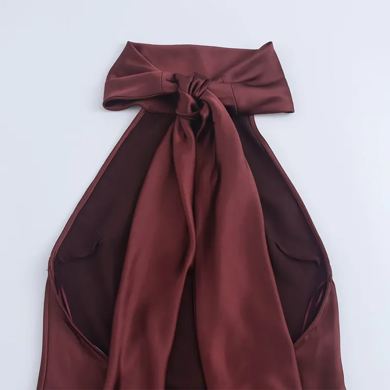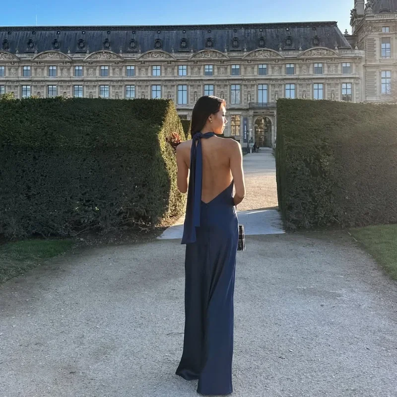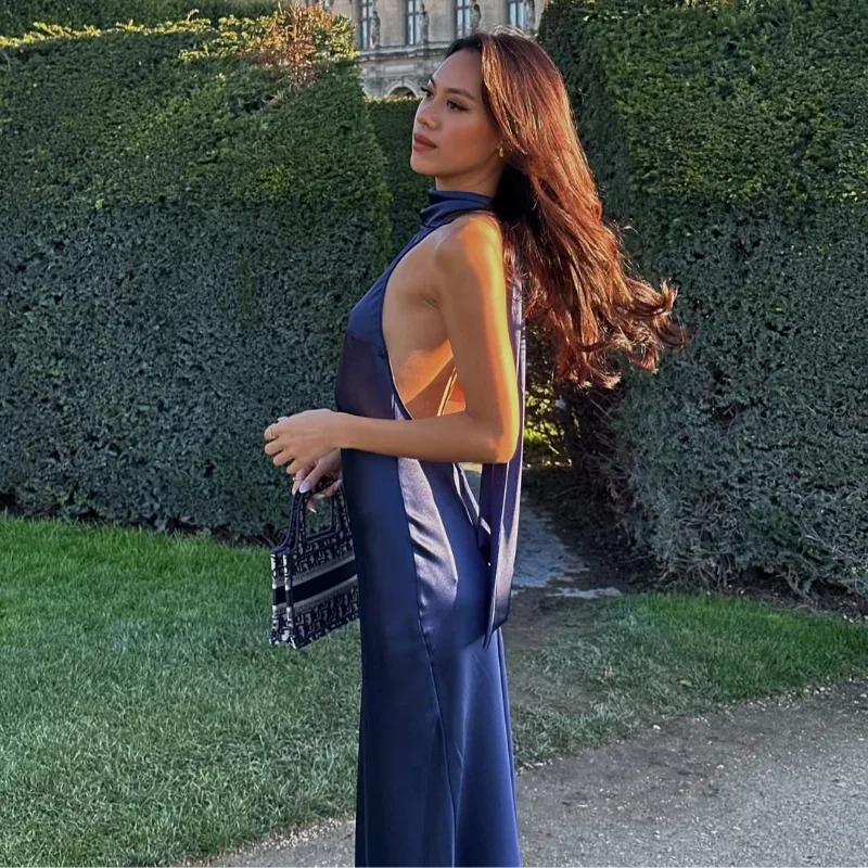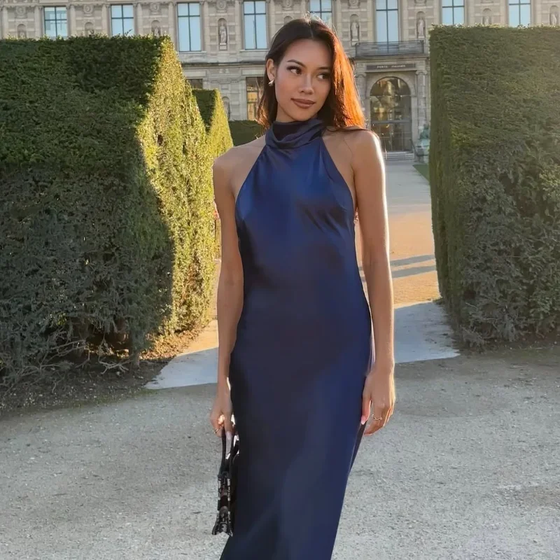 Buy Satin Halter Neckline Backless Sexy Maxi Dress Women Summer Ruffle Hem Slim Dresses Lady Evening Party Elegant Long Dresses 2025